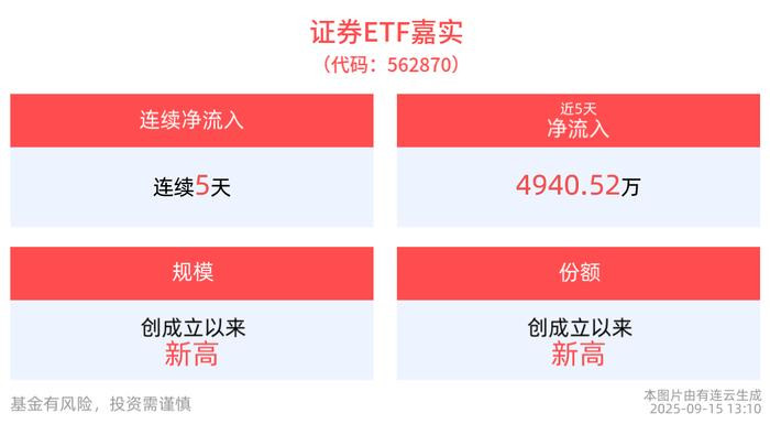 规模方面,证券ETF嘉实最新规模达4.66亿元,创成立以来新高。份额方面,证券ETF嘉实最新份额达4.40亿份,创成立以来新高。从资金净流入方面来看,证券ETF嘉实近5天获得连续资金净流入,最高单日获得1835.44万元净流入,合计“吸金”4940.52万元。